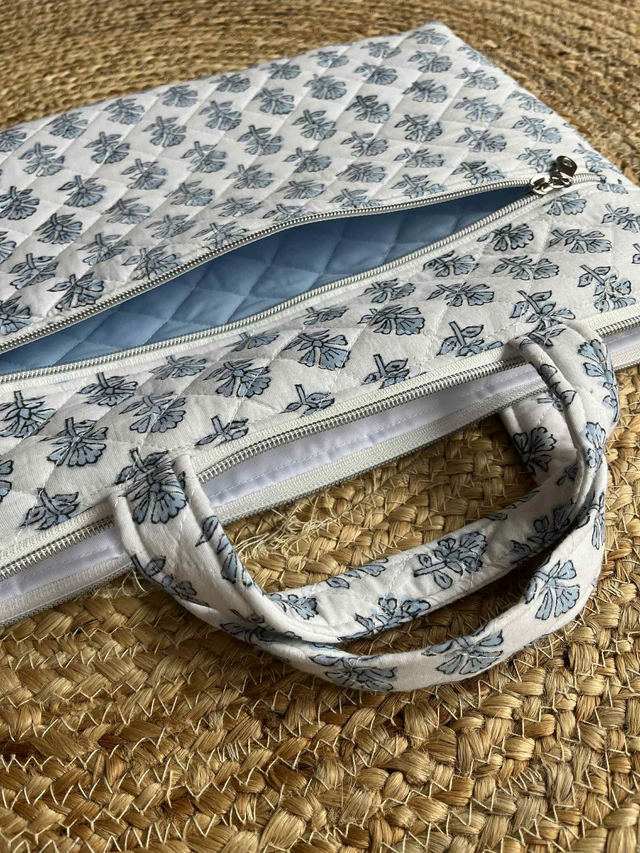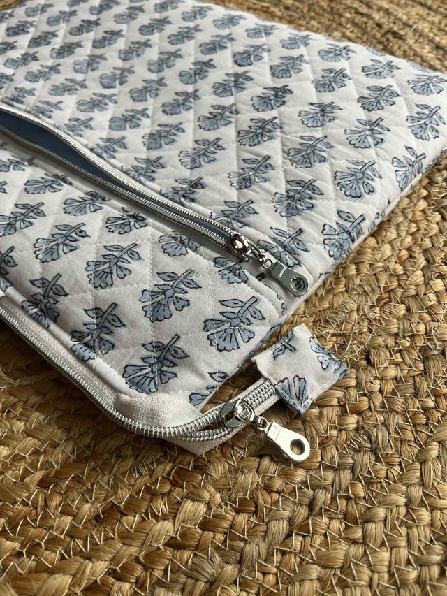 Protégez votre ordinateur avec style grâce à cette housse en coton imprimé à la main au tampon de bois, matelassée . L’intérieur en polyester imperméable garde votre appareil à l’abri, tandis que la poche zippée accueille chargeur et souris. Ses poignées pratiques facilitent le transport au quotidien.