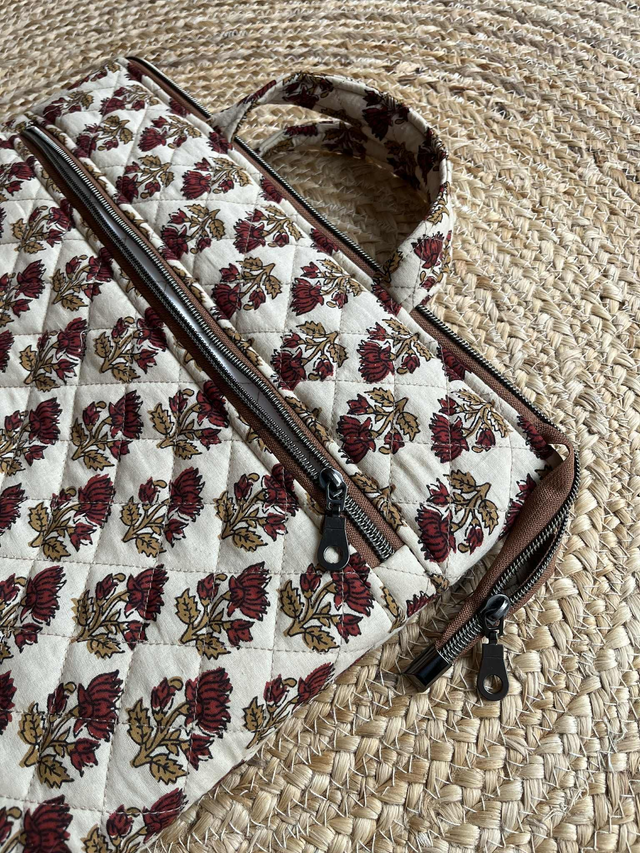 Protégez votre ordinateur avec style grâce à cette housse en coton imprimé à la main au tampon de bois, matelassée . L’intérieur en polyester imperméable garde votre appareil à l’abri, tandis que la poche zippée accueille chargeur et souris. Ses poignées pratiques facilitent le transport au quotidien.